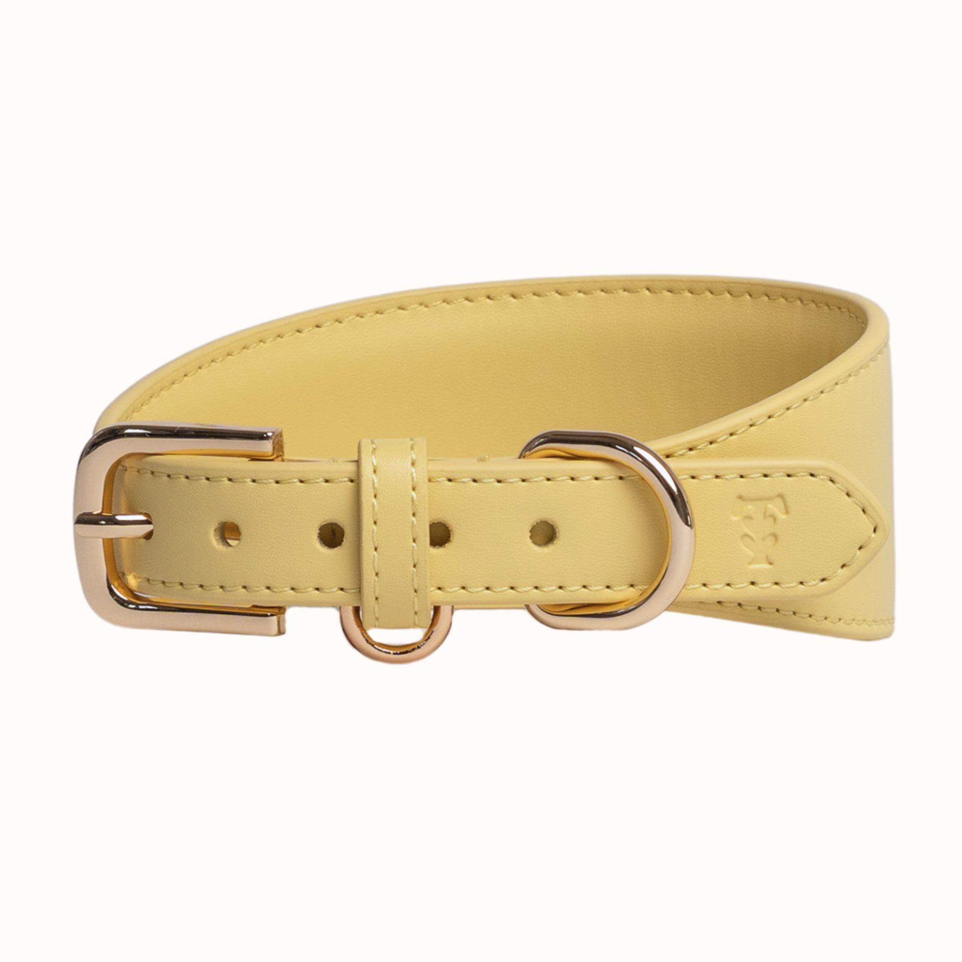 A beautiful and bold British design, crafted from smooth, butter yellow vegan leather and elegantly finished with gold hardware and a subtle debossed logo. Our hound collars are padded on the wider part to offer optimum support to the most delicate necks.